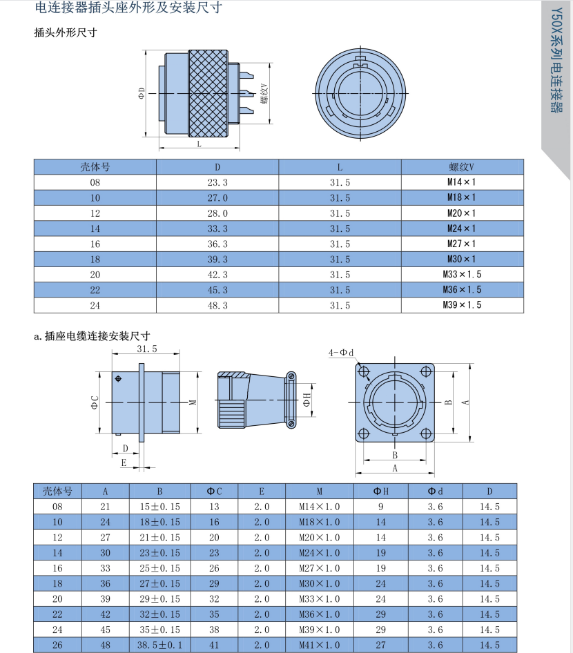 該系列航空插頭分三大類,Y50X是公制尺寸,同芯數(shù)外殼體尺寸偏大,插座安裝方式有方盤式,螺母緊固式及穿墻式,端接形式為焊接式,根據(jù)使用環(huán)境選擇不銹鋼或銅、鋁合金材料,一般用于戰(zhàn)略戰(zhàn)術(shù)系統(tǒng),電子對抗系統(tǒng),通訊信號連接系統(tǒng) ,進口醫(yī)療儀器設(shè)備等電能,電訊信號的連接。